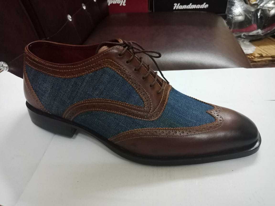 Handmade men two tone shoes, men wingtip jeans fabric shoes, dress leather shoes