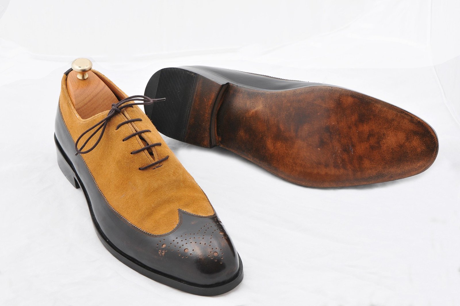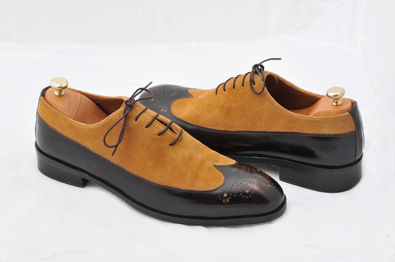 Handmade men two tone shoes, men tan suede shoes, men black dress formal shoes