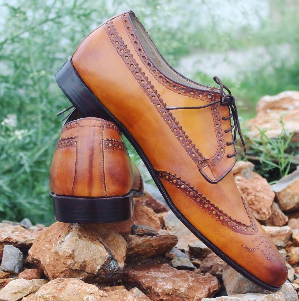 Handmade men tan shoes, wingtip brogue shoe for men, men formal leather shoes
