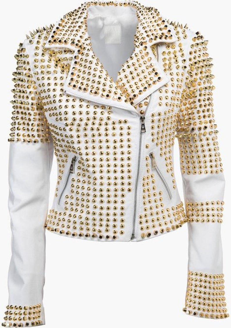 Men White Leather Jackets, Emo Golden Studded Punk Jacket, Men’s Party Jacket, Gold Studs Cowhide Leather, Men Studded Jacket
