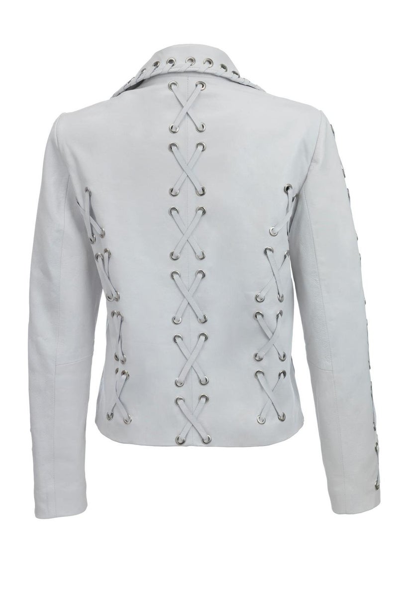 Women white leather jacket connected with white leather lace/strap, Leather jackets for women, Women winter outerwear, Biker jackets for women