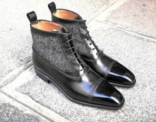 Men Handmade Leather and Tweed Boots, Handmade Boots for men, Black Boots for Men, Mens Boots