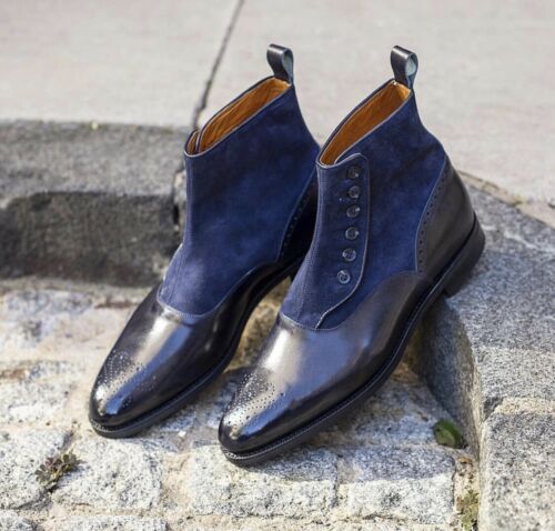Handmade Blue Suede and Black Leather Button Boots for Men, Men Ankle Boots, Formal Boots for Men, Men Dress Boots