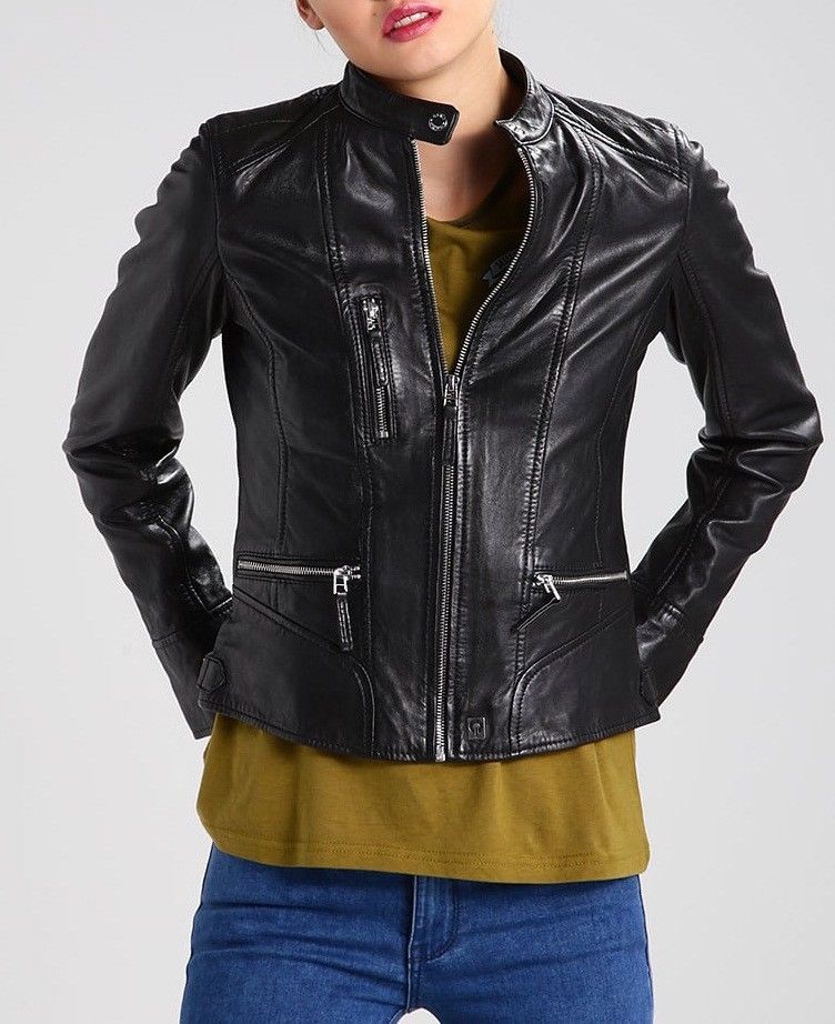 Women Black Real Cowhide High Neck Collar Leather Jackets, Stylish and Trendy Leather Jackets for Women