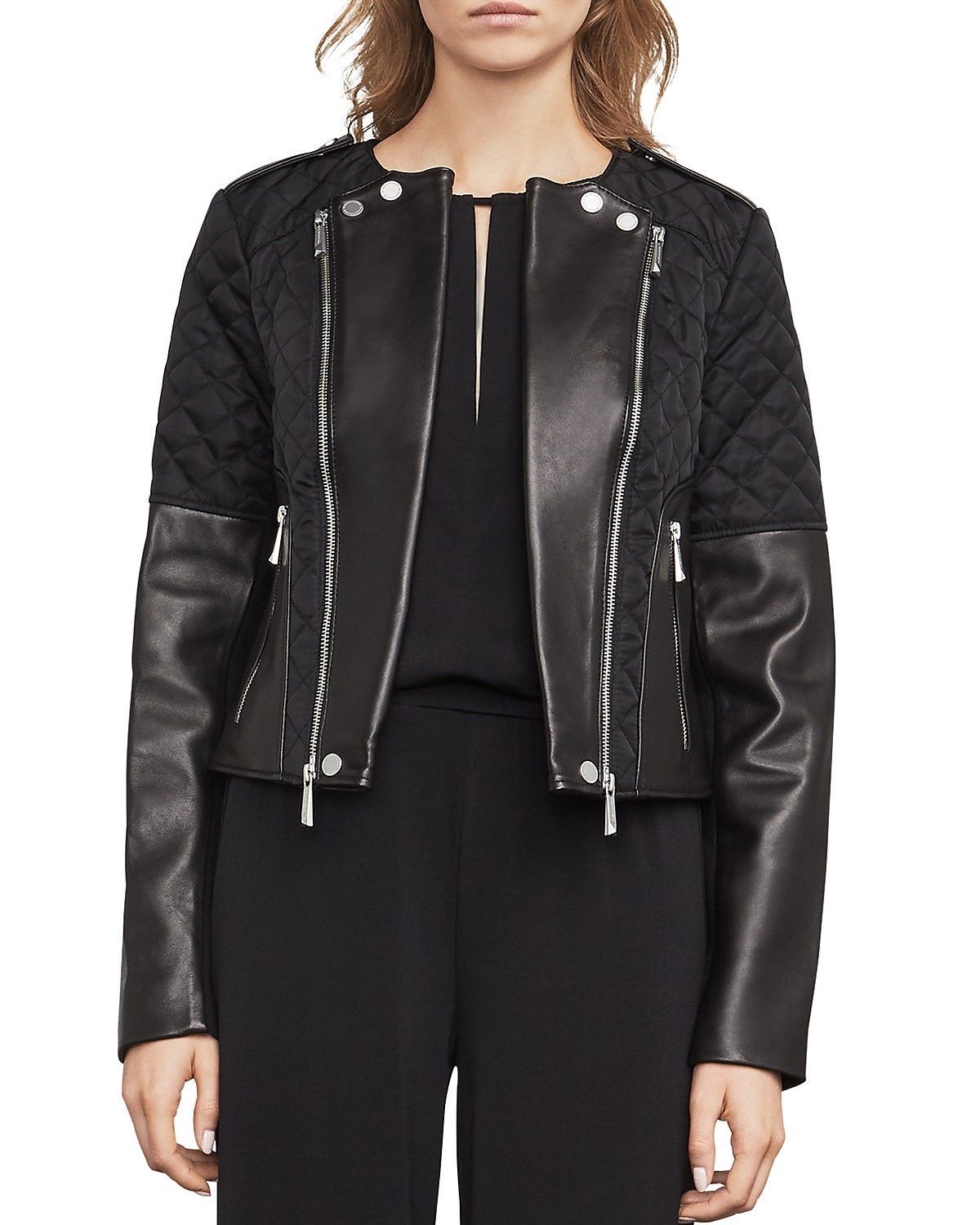 Women Quilted Leather and Fabric Jacket, Leather Jackets for Women, Quilted Jackets for Women