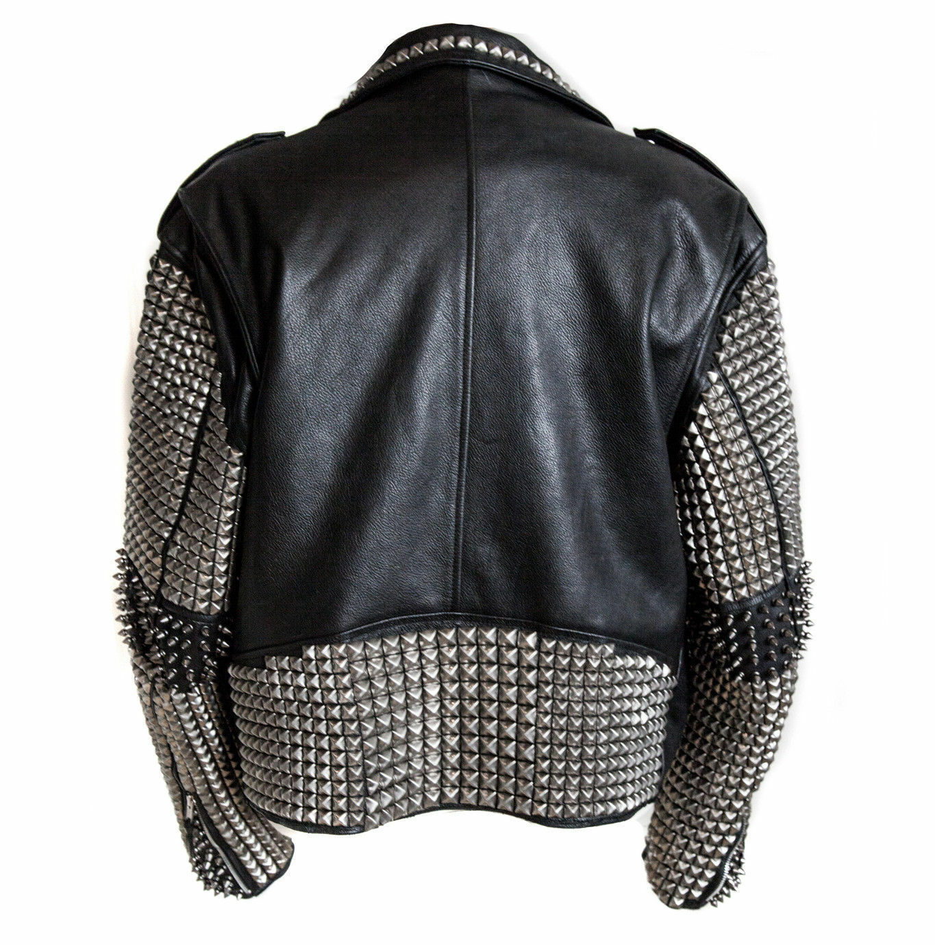NEW MEN'S FULL BLACK PUNK SILVER SPIKED STUDDED COWHIDE LEATHER JACKET
