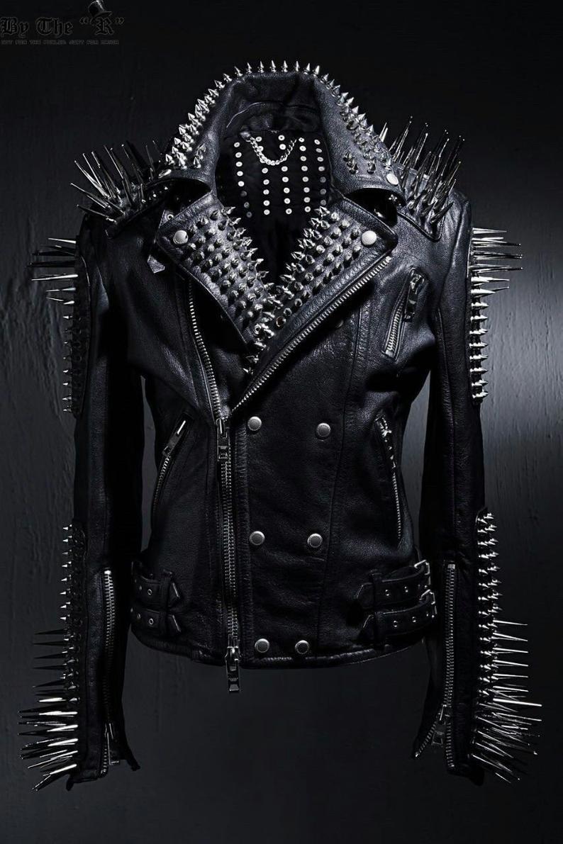 NEW HANDMADE Mens Full Black Punk Silver Long Spiked Studded Leather