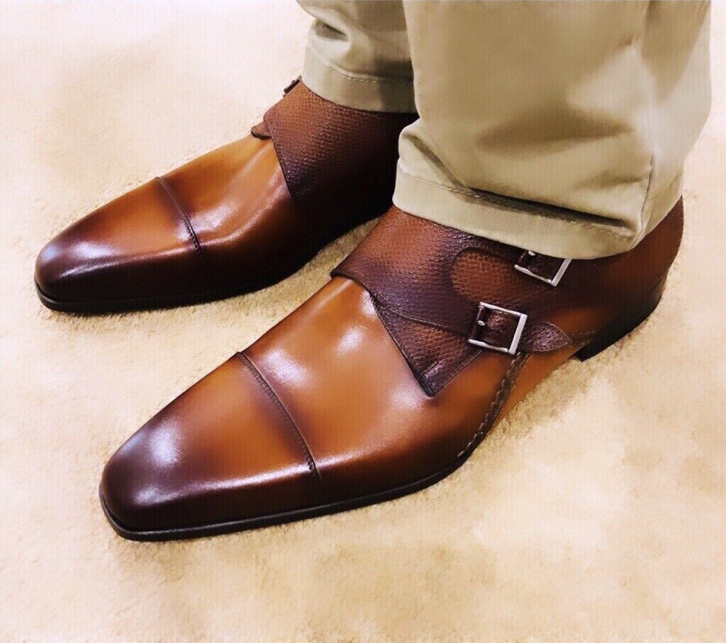 New Pure Handmade Tan Shaded Leather Double Monk Strap Shoes for Men's
