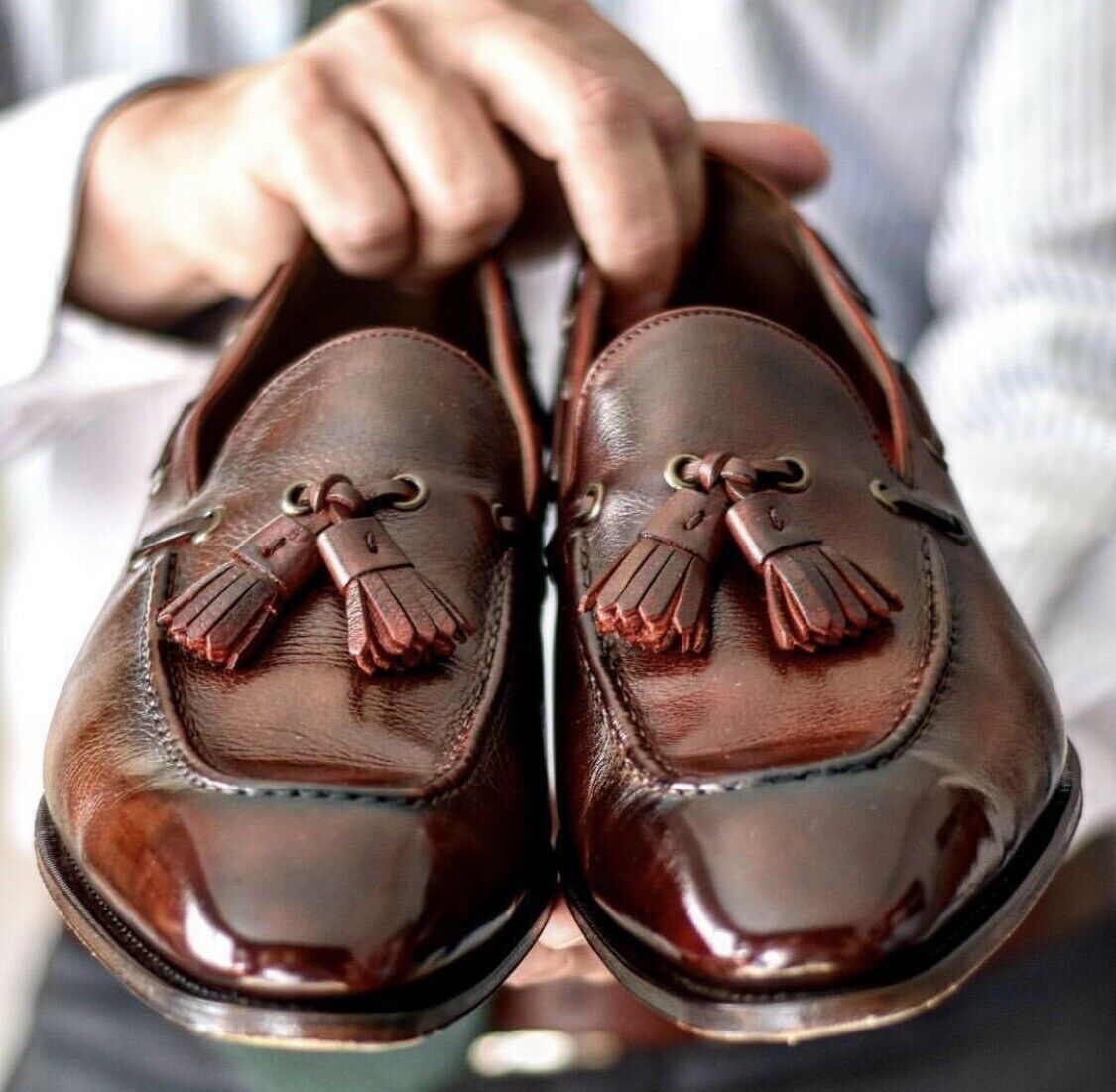 New Pure Handmade Burgundy Shaded Leather Tassel Loafer Shoes for Men's