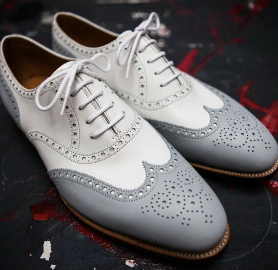 New Pure Handmade White & Gray Leather Lace up Brogue Shoes for Men's
