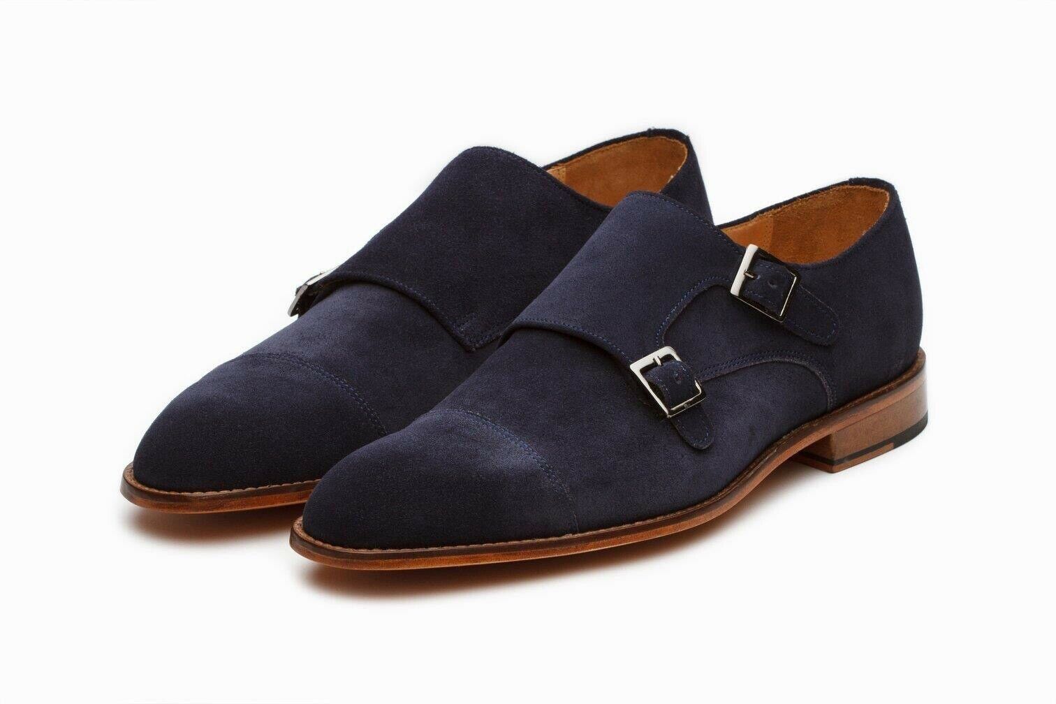 New Pure Handmade Suede Leather Navy Blue Monk Strap Shoes for Men's
