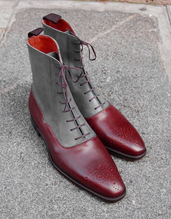 New Men's Handmade Ankle Leather Designer, Two Tone Burgundy Ankle High Boots