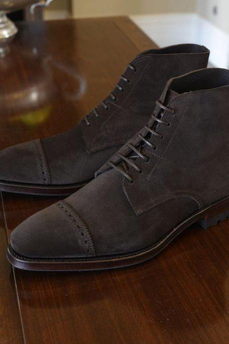Handmade Men Cap Toe Lace Up Dress Boots, Real Suede High Ankle Men Boots