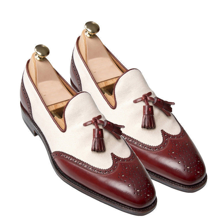 New Men's White Maroon Wing Tip Brogues Cap Toe Premium Leather Tassel Loafer SlipOn Dress Shoes