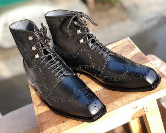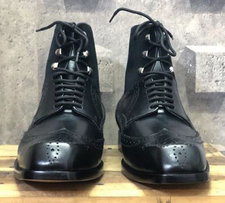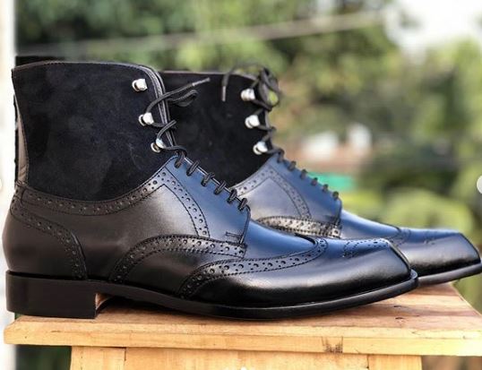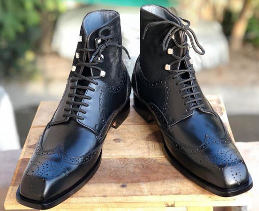 Handmade Men's Wing Tip Brogue Lace Up Square Toe Leather Suede Dress Boots