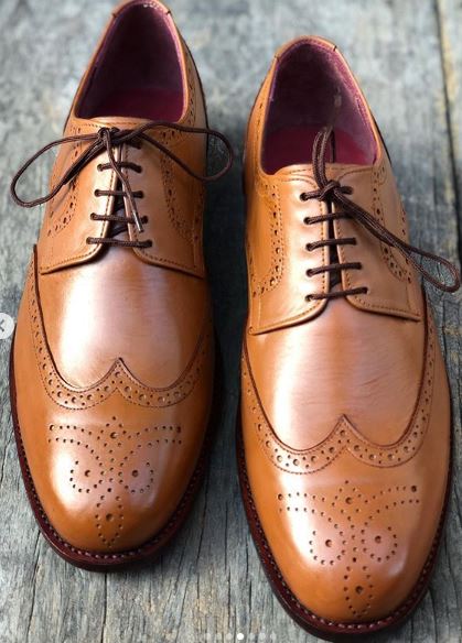 Handmade Men Tan Wing Tip Brogue Lace Up Dress Shoes, Genuine Leather Shoes