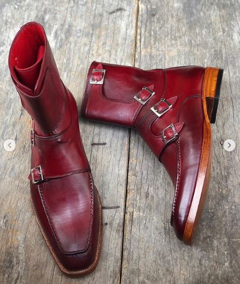 Handmade Men's Maroon Four Monk Strap High Ankle Dress Boots, Real Leather