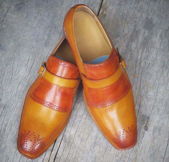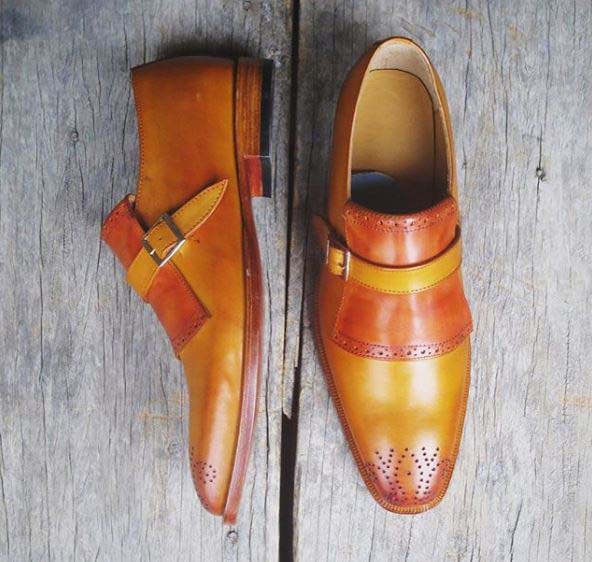 Handmade Men's Brogue Monk Strap Square Toe Dress Shoes, Real Leather Shoes