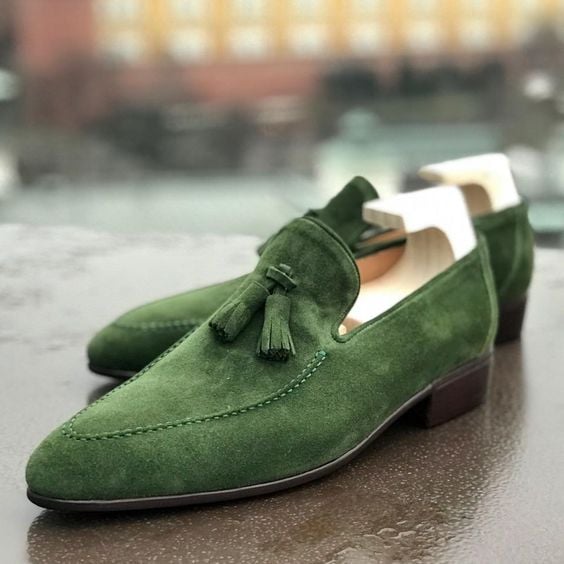 Men stylish Green Suede Moccasin Dress Shoes with Tassels, Men Slip on Shoes