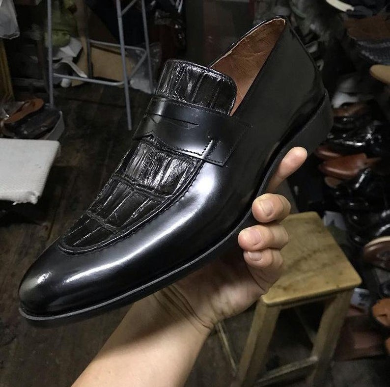 Men Handmade Black Crocodile Leather Business Moccasin Loafer Shoes