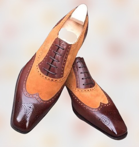 Handmade Men Brown Leather and Tan Suede Brogue Formal Dress Shoes