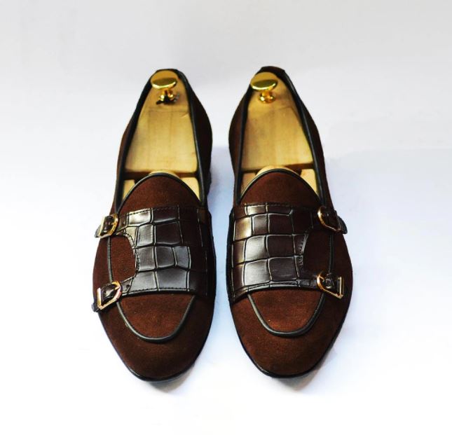 Handmade Men Brown Suede and Textured Leather double monk moccasin shoes