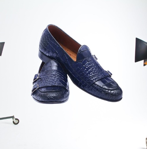 Handmade Men Blue Crocodile Texture Leather Double Monk Moccasin Shoes
