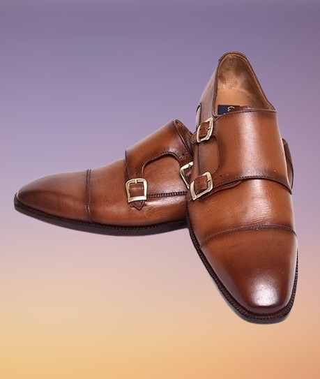 Men Brown Leather Double Monk Formal Dress Shoes, Handmade Monk Shoes