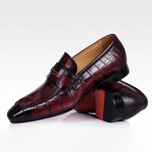 Men Handmade Burgundy Crocodile Texture Leather Moccasin Shoes, Business Shoes
