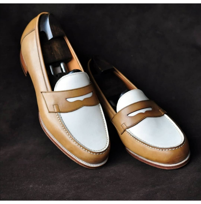 Men Handmade Tan and White Casual Loafer Shoes, Casual Peas Shoes