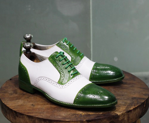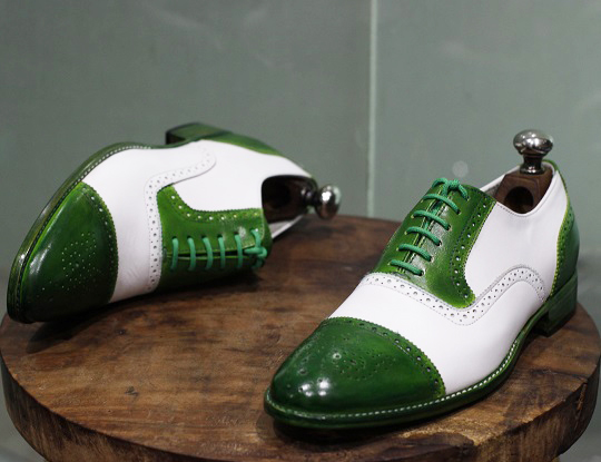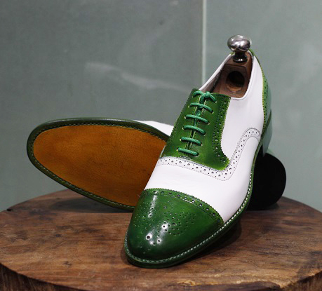 Men Two Tone Green and White Leather Brogue shoes, Handmade Dress Shoes
