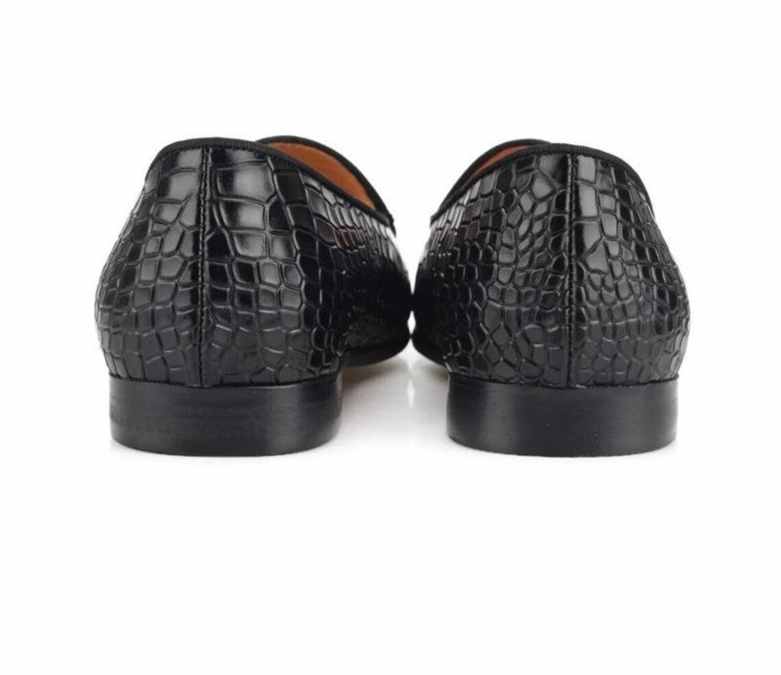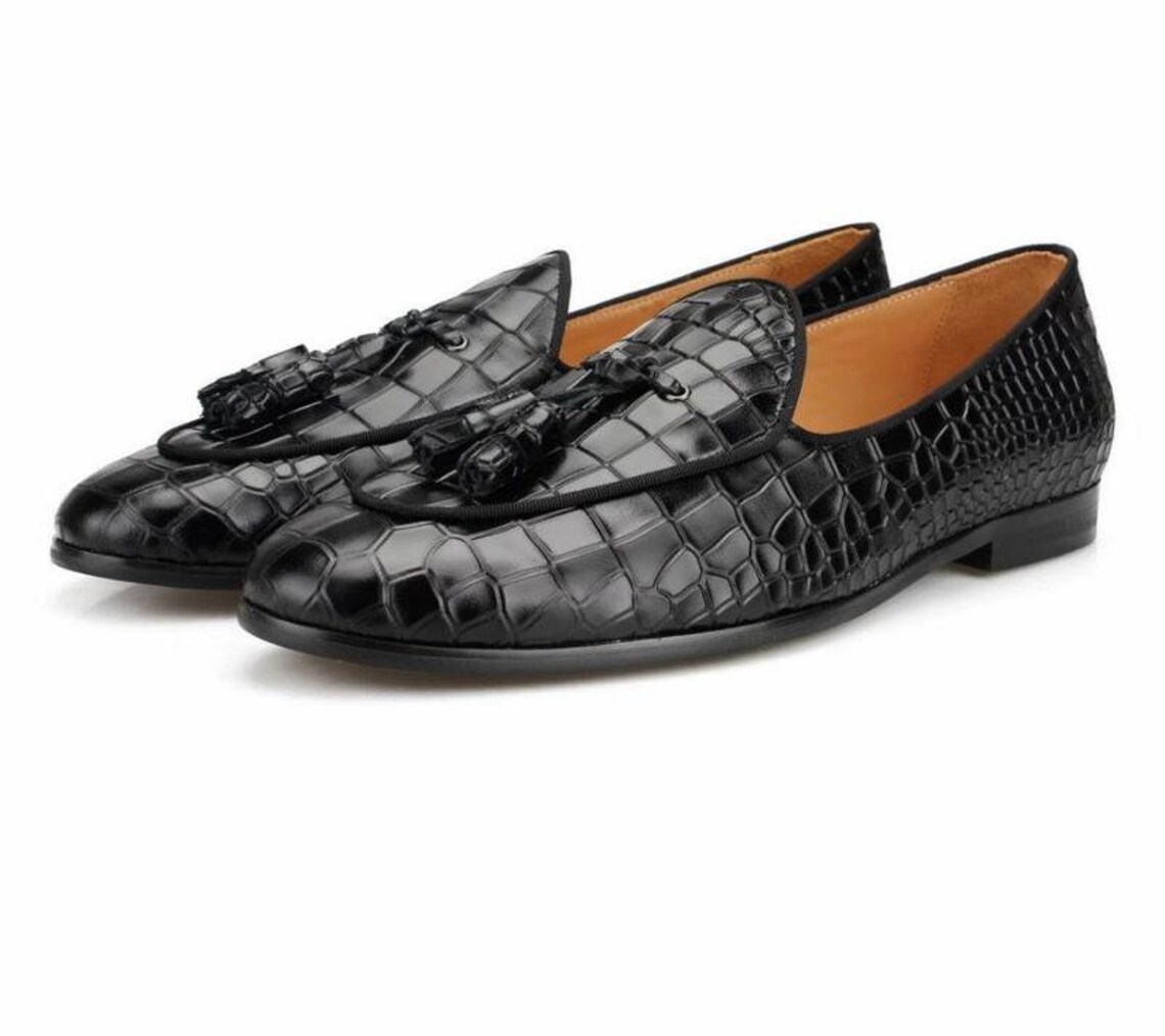 Men Handmade Black Crocodile Texture Leather Tassel Loafer Shoes, Crocodile Office Shoes