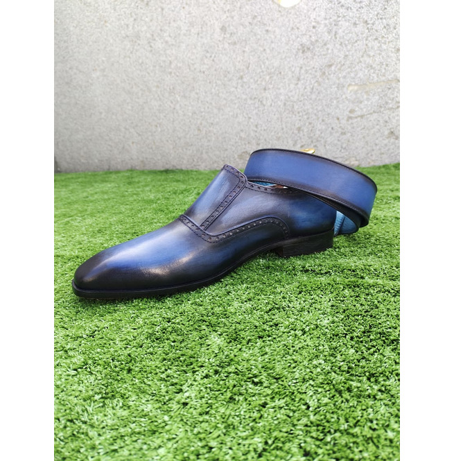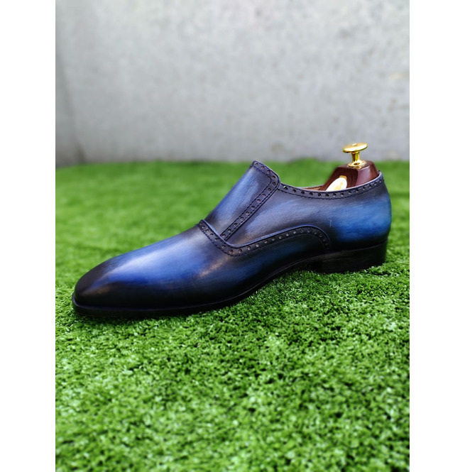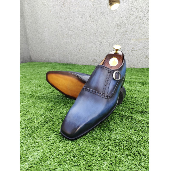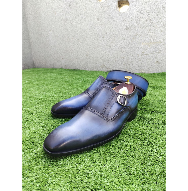 Handmade Men Patina Style Monk Shoes, Blue Leather Shaded Dress Shoes